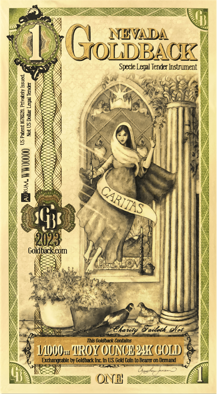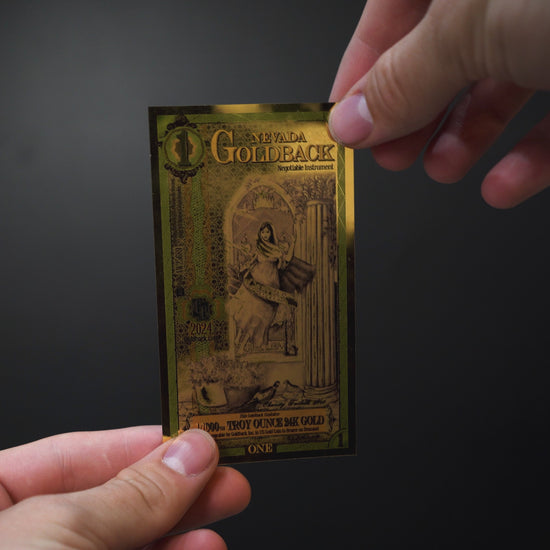El Nevada 1 Goldback contiene 1/1000 de onza troy de oro de 24 quilates. Este billete forma parte de la primera moneda de oro voluntaria y gastable, ideal tanto para coleccionistas como para el uso diario de oro fraccionario.