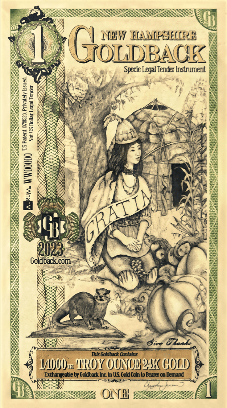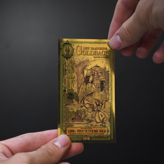 El billete de 1 Goldback de New Hampshire contiene 1/1000 de onza troy de oro de 24 quilates. Este billete forma parte de la primera moneda de oro voluntaria y gastable, ideal tanto para coleccionistas como para el uso diario de oro fraccionario.