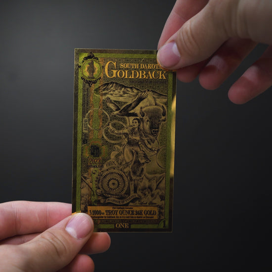 La moneda South Dakota 1 Goldback contiene 1/1000 de onza troy de oro de 24 quilates. Representa a Pax, la diosa romana de la paz. En este diseño se la representa como una mujer nativa americana Lakota que viste un atuendo tradicional y baila con aros, con anillos entrelazados y vida silvestre, lo que refleja la armonía y la serena belleza de Dakota del Sur.
