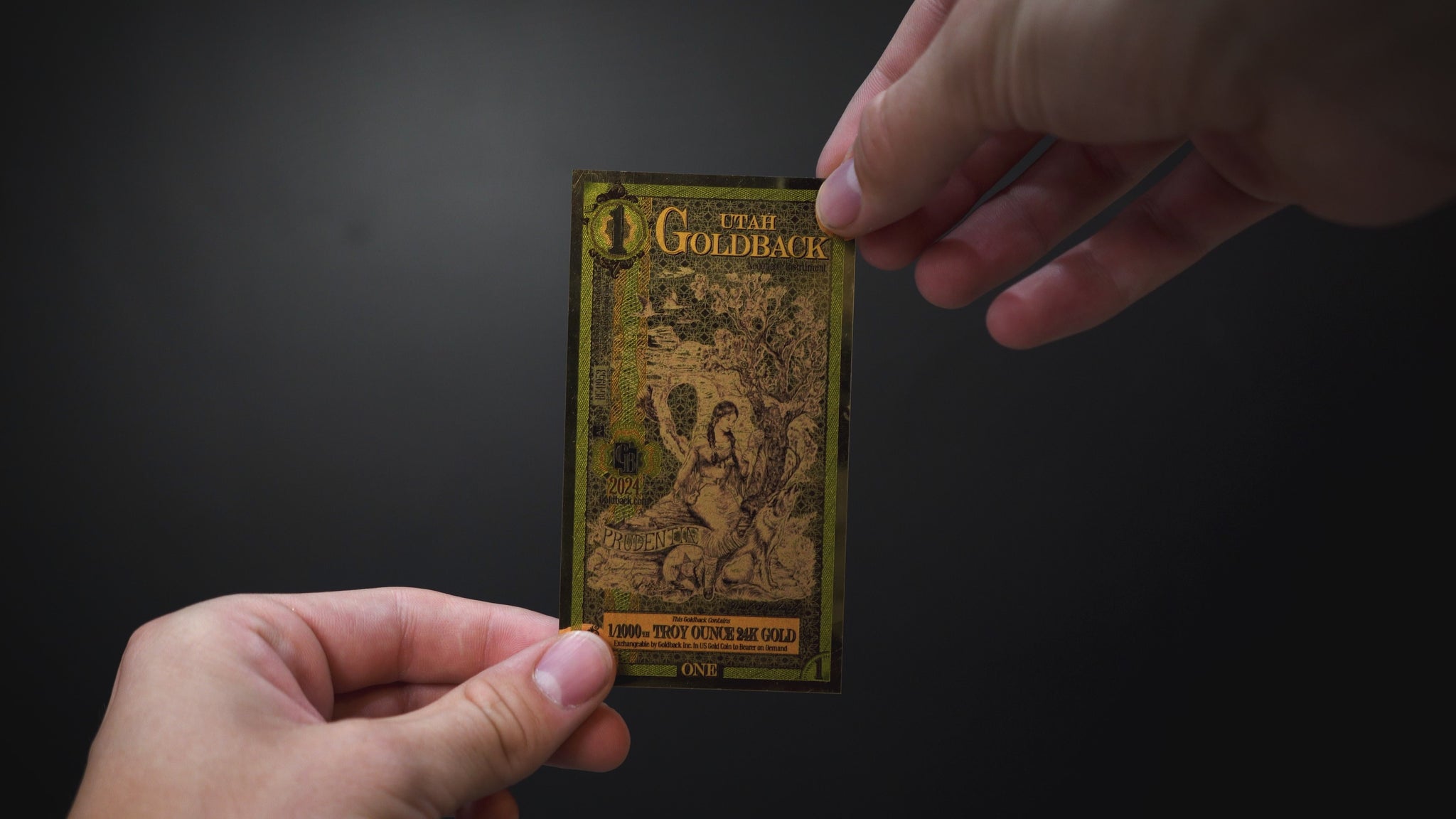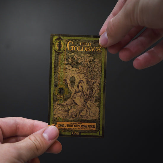El Utah 1 Goldback contiene 1/1000 oz de onza troy de oro de 24 quilates. Este billete forma parte de la primera moneda de oro voluntaria y gastable, ideal tanto para coleccionistas como para el uso diario de oro fraccionario.