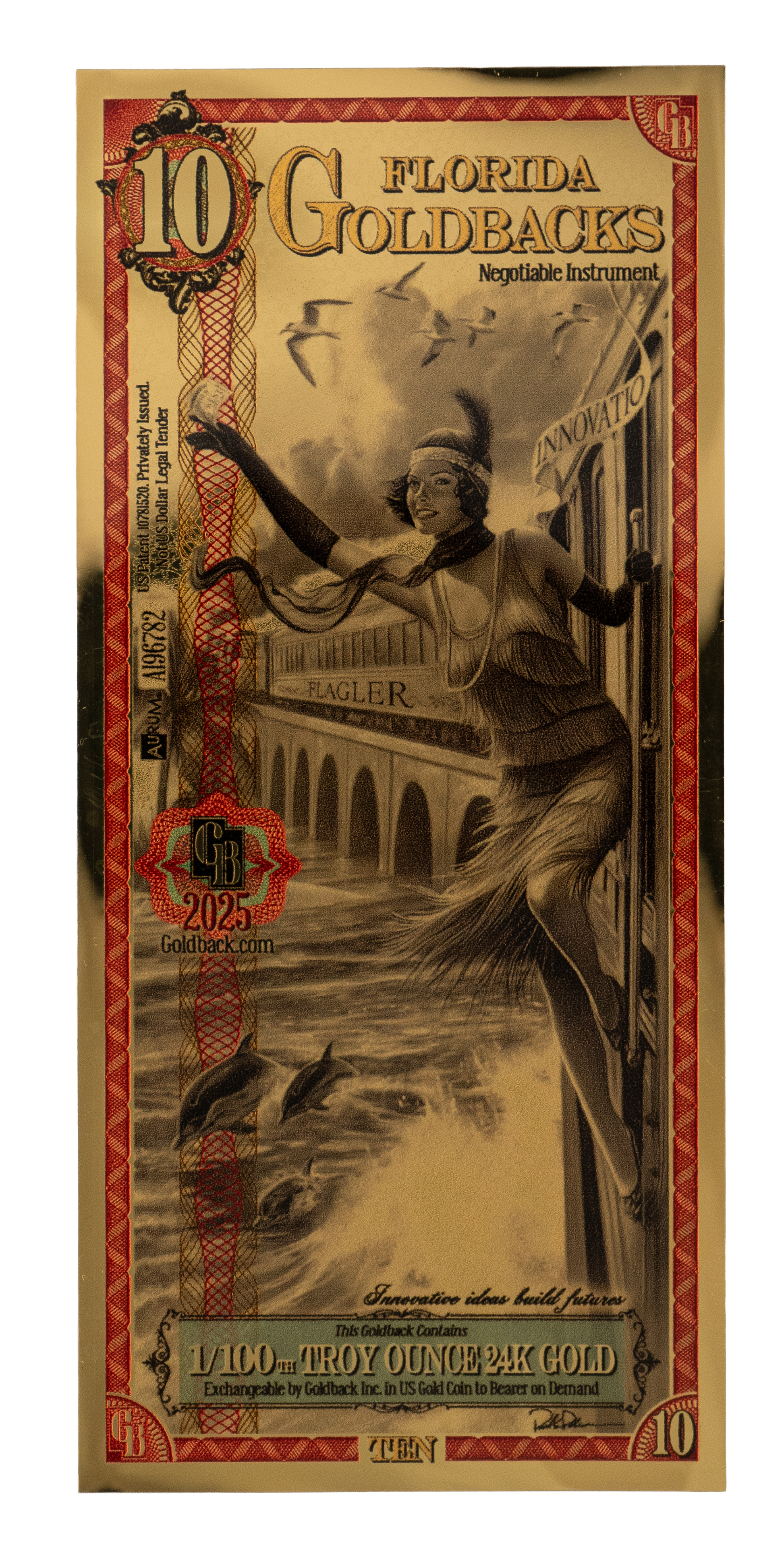 Design: This Goldback celebrates Innovatio, or Innovation, with a depiction of a 1920s-era flapper riding the Florida East Coast Railway. With 1/100 troy ounce of .999 fine gold, it represents the transformative spirit of the early 20th century, when Florida rapidly evolved through transportation, tourism, and modern ideas. A tribute to creativity, progress, and freedom of expression.