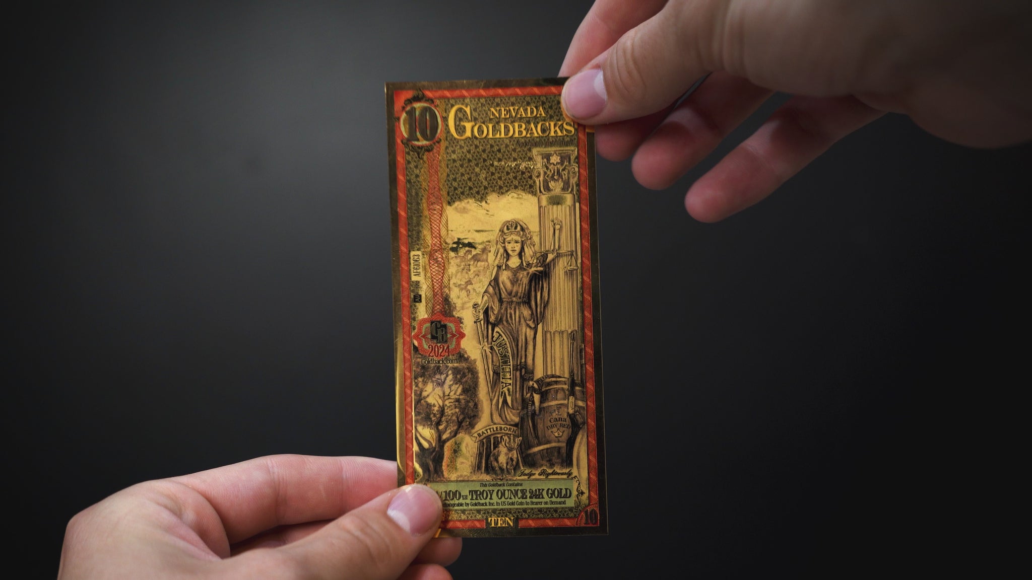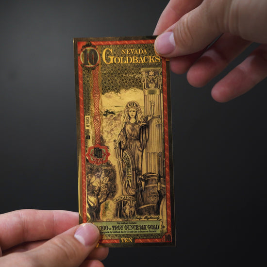 El Nevada 10 Goldback contiene 1/100 de onza troy de oro de 24 quilates. Este billete forma parte de la primera moneda de oro voluntaria y gastable, ideal tanto para coleccionistas como para el uso diario de oro fraccionario.