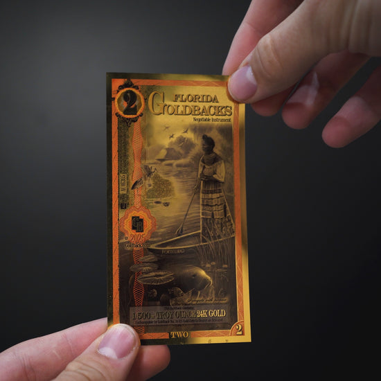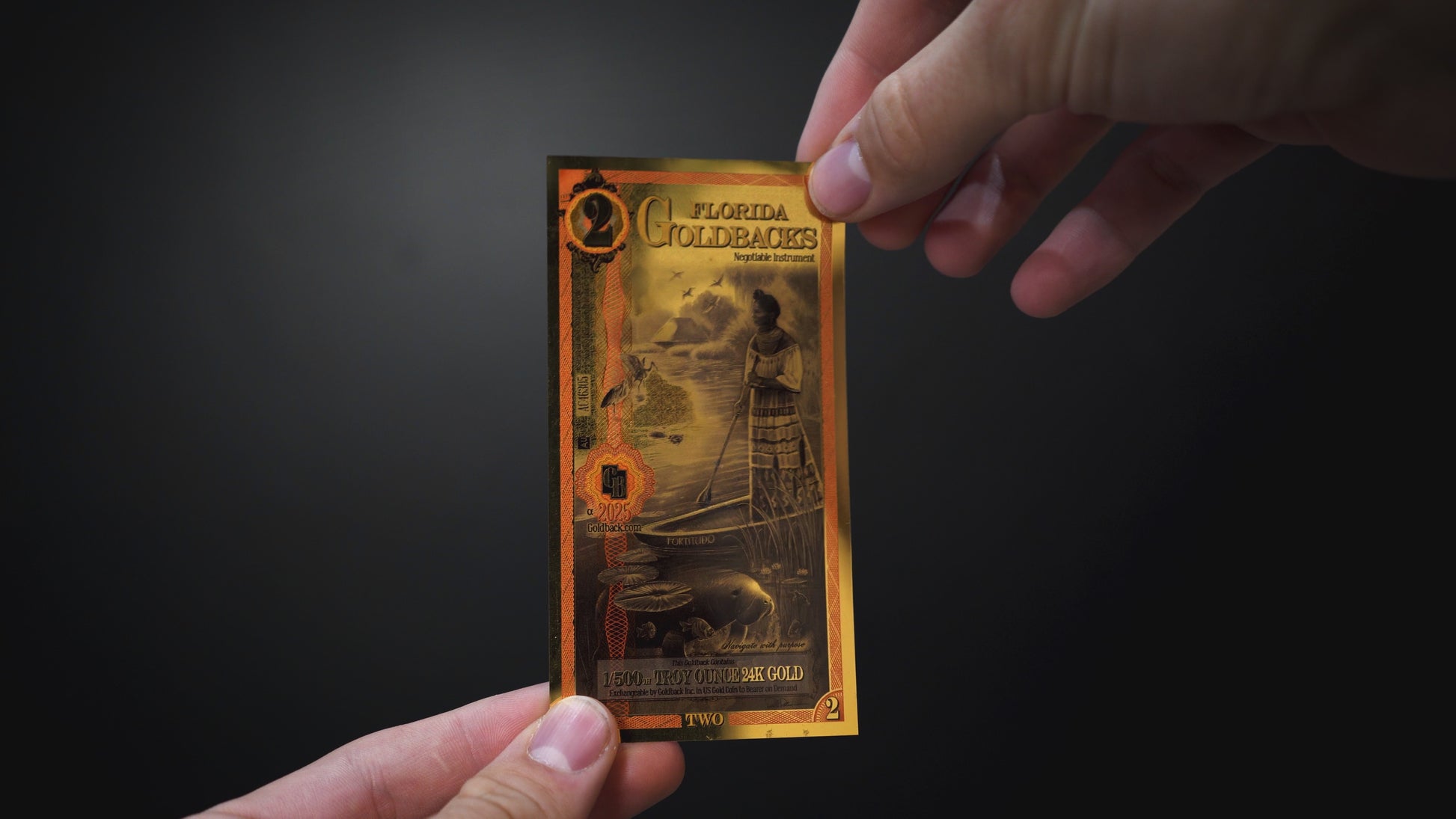 El Florida 2 Goldback contiene 1/500 de onza troy de oro de 24 quilates. Este billete forma parte de la primera moneda de oro voluntaria y gastable, ideal tanto para coleccionistas como para el uso diario de oro fraccionario.