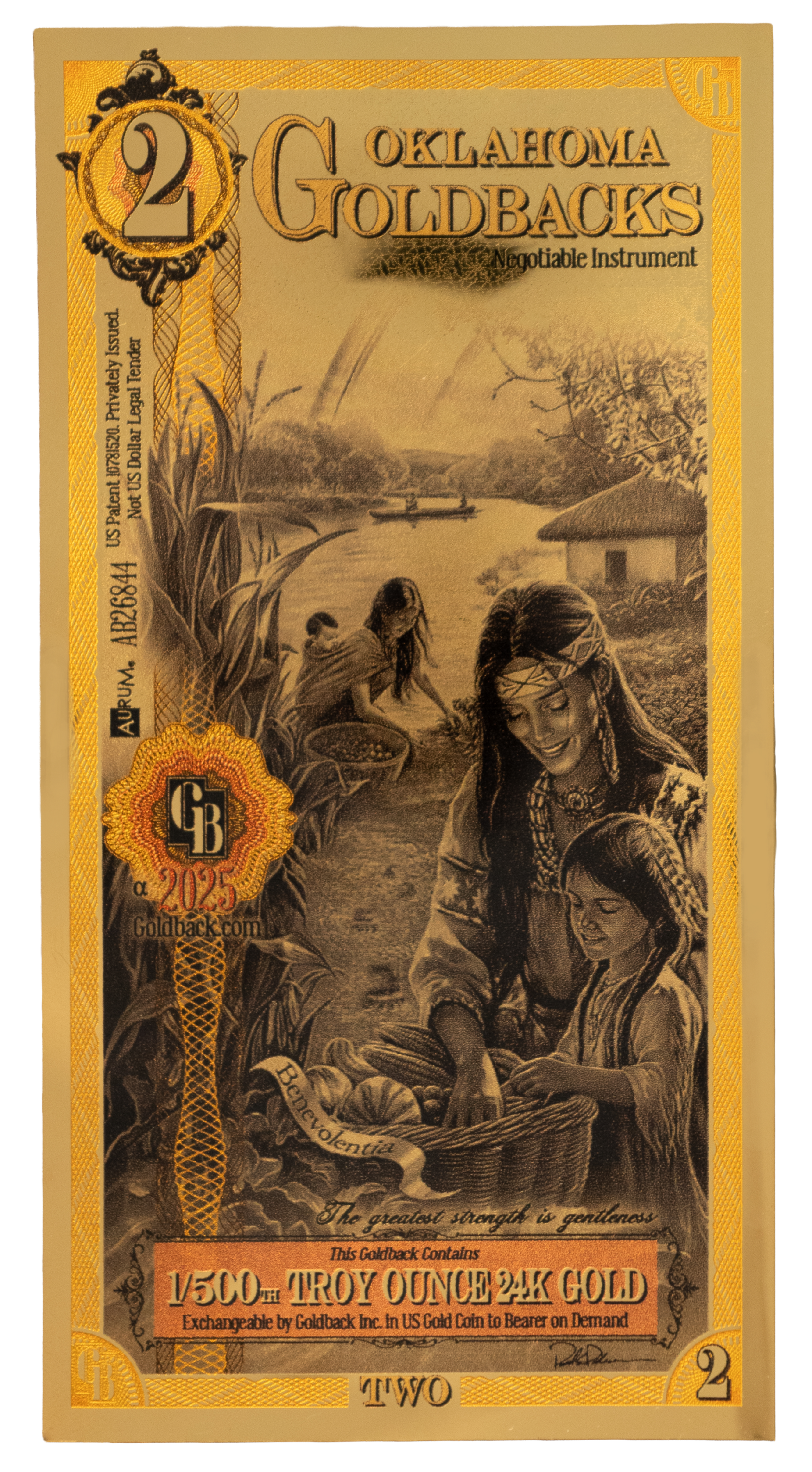 Diseño: El Oklahoma 2 Goldback encarna la virtud de la Benevolentia, o Bondad, vivida y transmitida de generación en generación por mujeres indígenas. En el centro de la escena se encuentra una madre Cherokee con un vestido tradicional de lágrimas y una diadema de cuentas. La cesta tejida en sus brazos rebosa de la abundancia de la tierra. A lo lejos, una segunda madre cuida la cosecha con un papoose a la espalda, simbolizando la naturaleza intergeneracional de la enseñanza y la crianza. Sobre las figuras, una rama del árbol estatal de Oklahoma, el Cercis oriental, se arquea sobre la escena. Fluyendo detrás de las figuras se encuentra el río Illinois. Canoas se deslizan por el río, ilustrando la profunda conexión indígena con el agua. Cerca, una casa Asi representa tanto el ingenio arquitectónico como la vida comunitaria. Las huellas en el suelo aluden sutilmente al Sendero de las Lágrimas, uno de los capítulos más dolorosos de la historia estadounidense. Un arcoíris se arquea en lo alto, simbolizando la sanación, la esperanza y un futuro mejor. Hoy en día, Oklahoma alberga 39 tribus reconocidas a nivel federal, cada una con un patrimonio distintivo. Esta obra de arte se creó con la colaboración de asesores culturales y artistas de varias tribus de Oklahoma, incluyendo un artista choctaw registrado que sugirió el tema. Este billete de oro recuerda a los espectadores de todo el mundo que la benevolencia es más que amabilidad: es una forma de vida. Al pie de esta nota está escrita la verdad imperecedera: «La mayor fortaleza es la gentileza».
