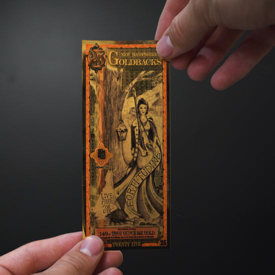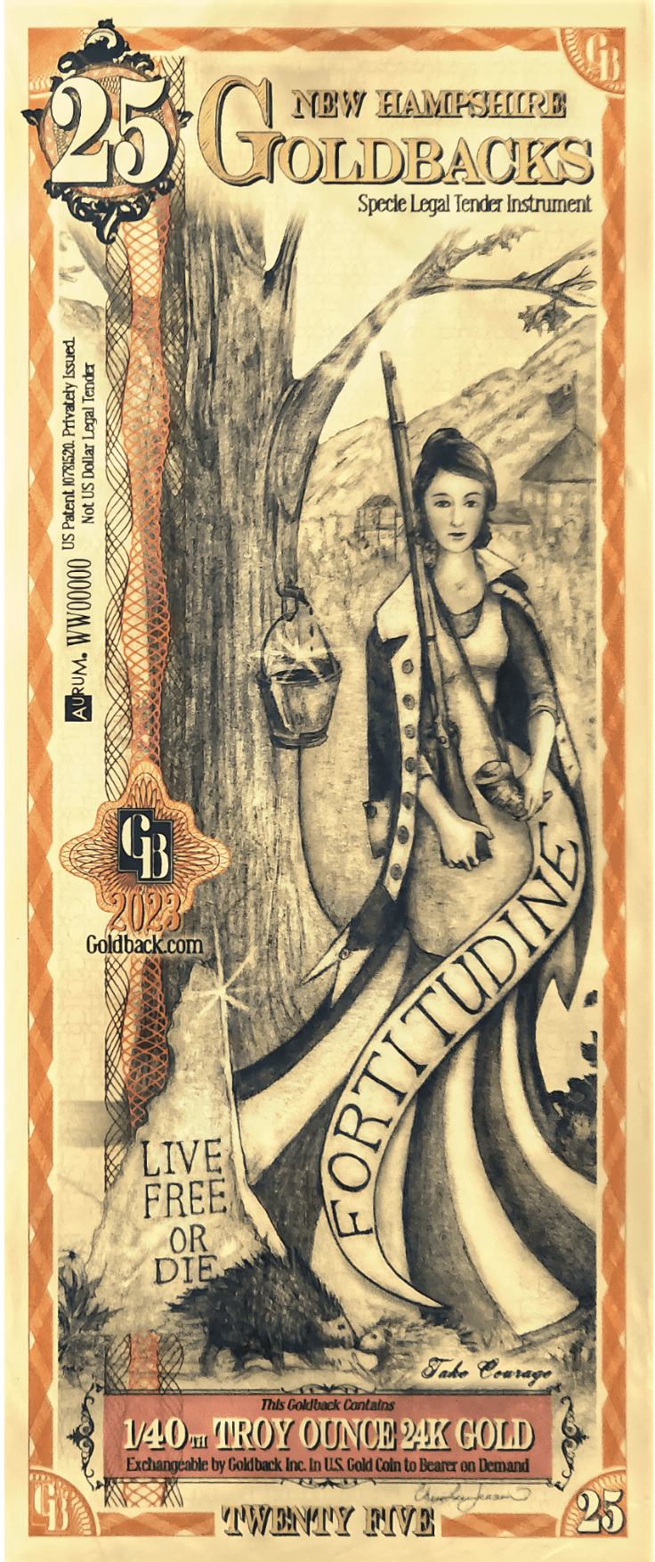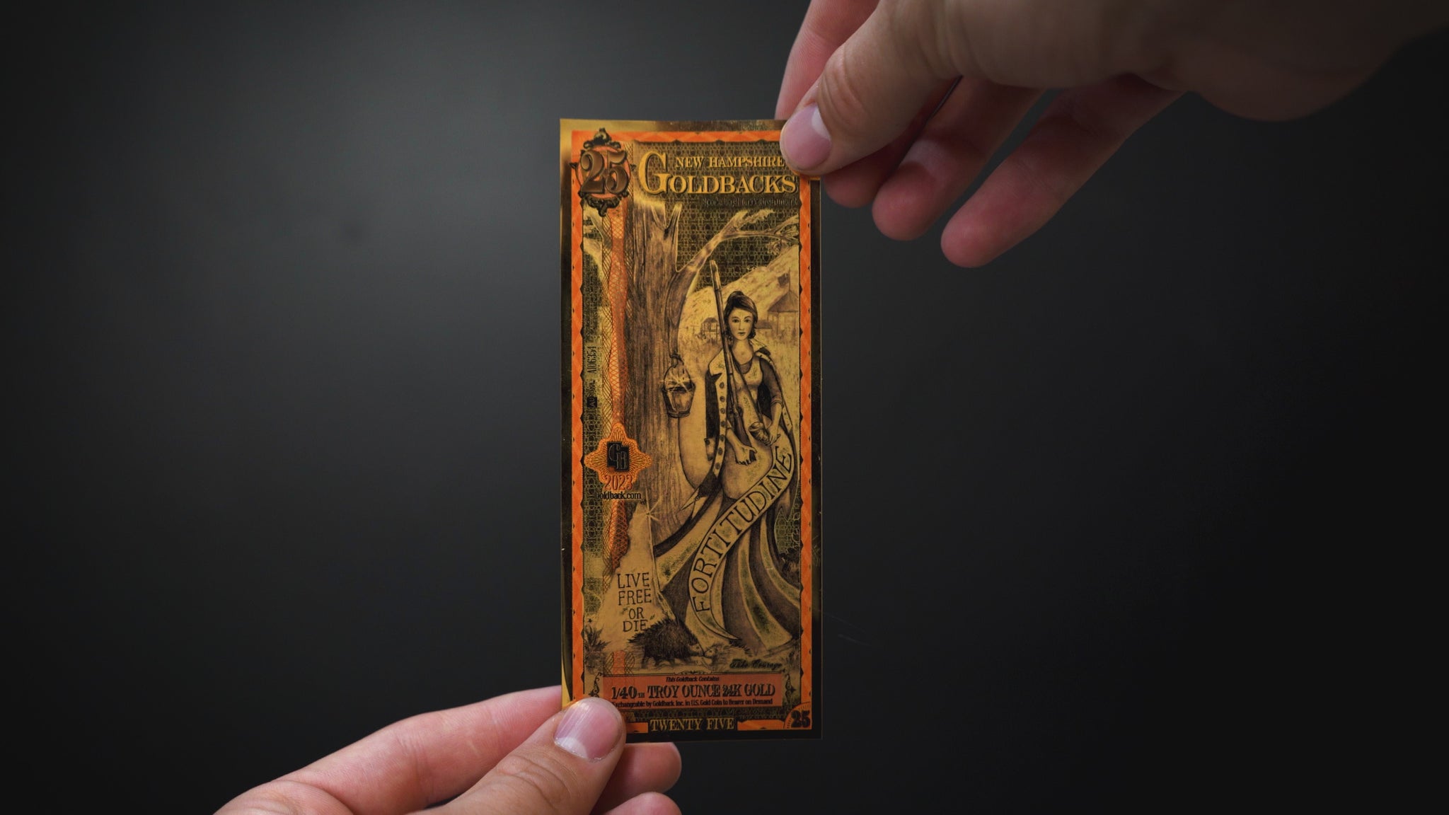 El billete de 25 dólares de New Hampshire contiene 1/40 de onza troy de oro de 24 quilates. Este billete forma parte de la primera moneda de oro voluntaria y gastable, ideal tanto para coleccionistas como para el uso diario de oro fraccionario.