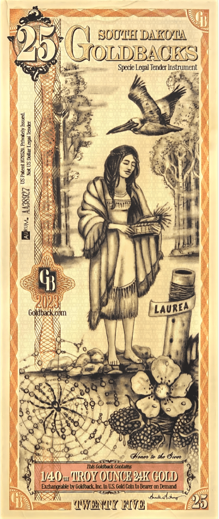 Diseño: La moneda South Dakota 25 Goldback presenta la Virtud Laurea, u Honor, inspirada en una leyenda de la Isla de la Doncella en el lago Kampeska. La historia cuenta la historia de Minnecotah, una joven enamorada de un cazador de Wahpeton. Para ahuyentar a otros pretendientes, los retó a lanzar la piedra más lejos en el lago, prometiendo casarse con el ganador.