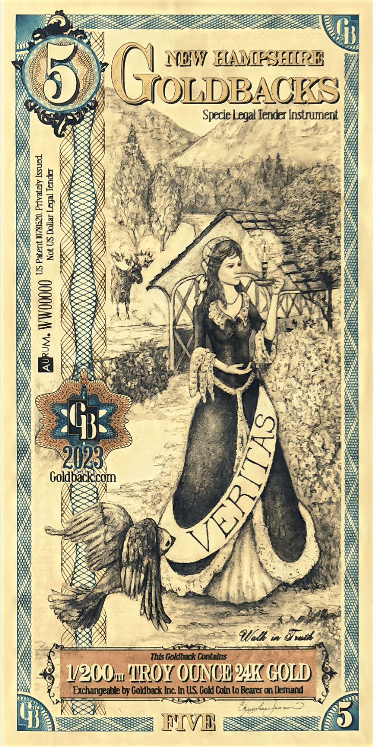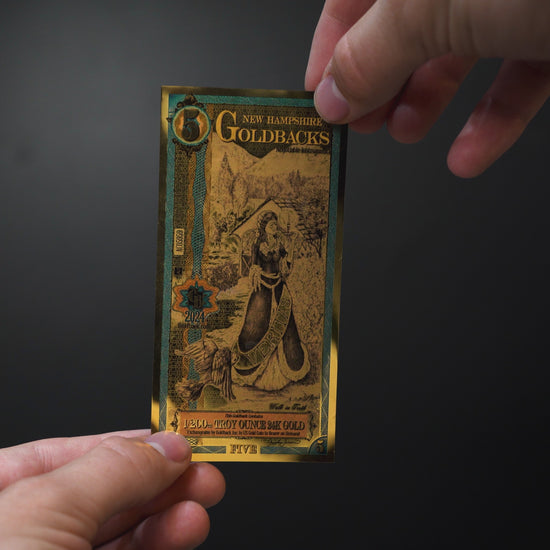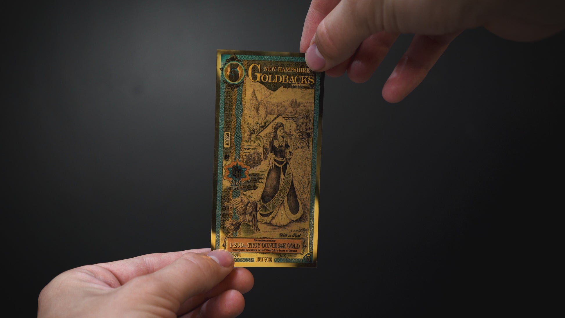El billete de 5 dólares de New Hampshire contiene 1/200 de onza troy de oro de 24 quilates. Este billete forma parte de la primera moneda de oro voluntaria y gastable, ideal tanto para coleccionistas como para el uso diario de oro fraccionario.