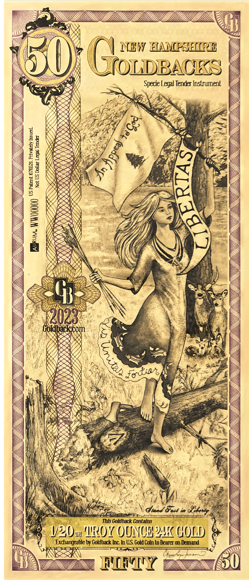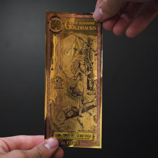 El billete de 50 Goldback de New Hampshire contiene 1/20 de onza troy de oro de 24 quilates. Este billete forma parte de la primera moneda de oro voluntaria y gastable, ideal tanto para coleccionistas como para el uso diario de oro fraccionario.