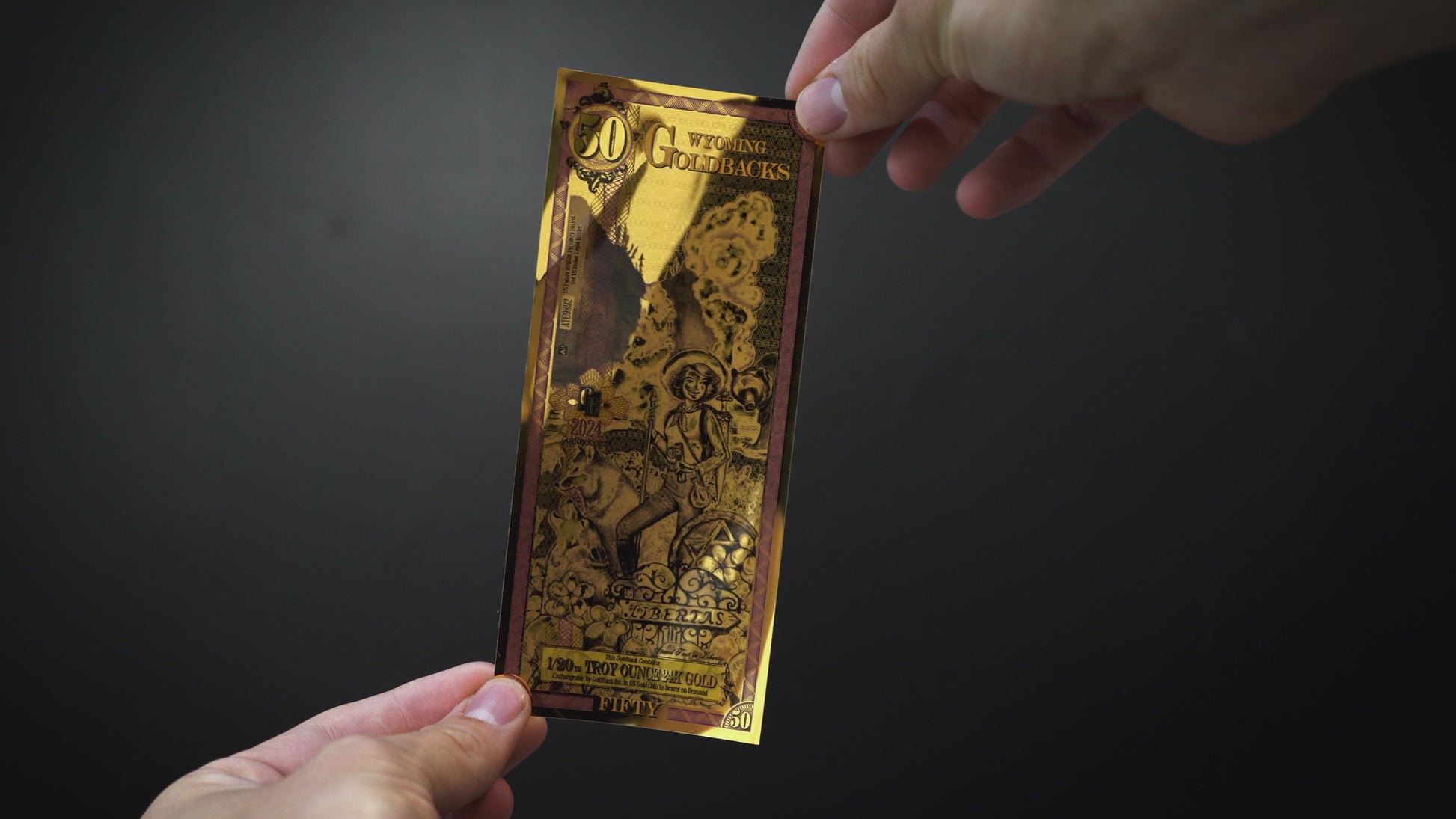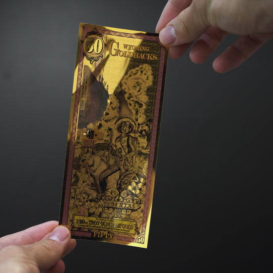 El Wyoming 50 Goldback contiene 1/20 de onza troy de oro de 24 quilates. Este billete forma parte de la primera moneda de oro voluntaria y gastable, ideal tanto para coleccionistas como para el uso diario de oro fraccionario.