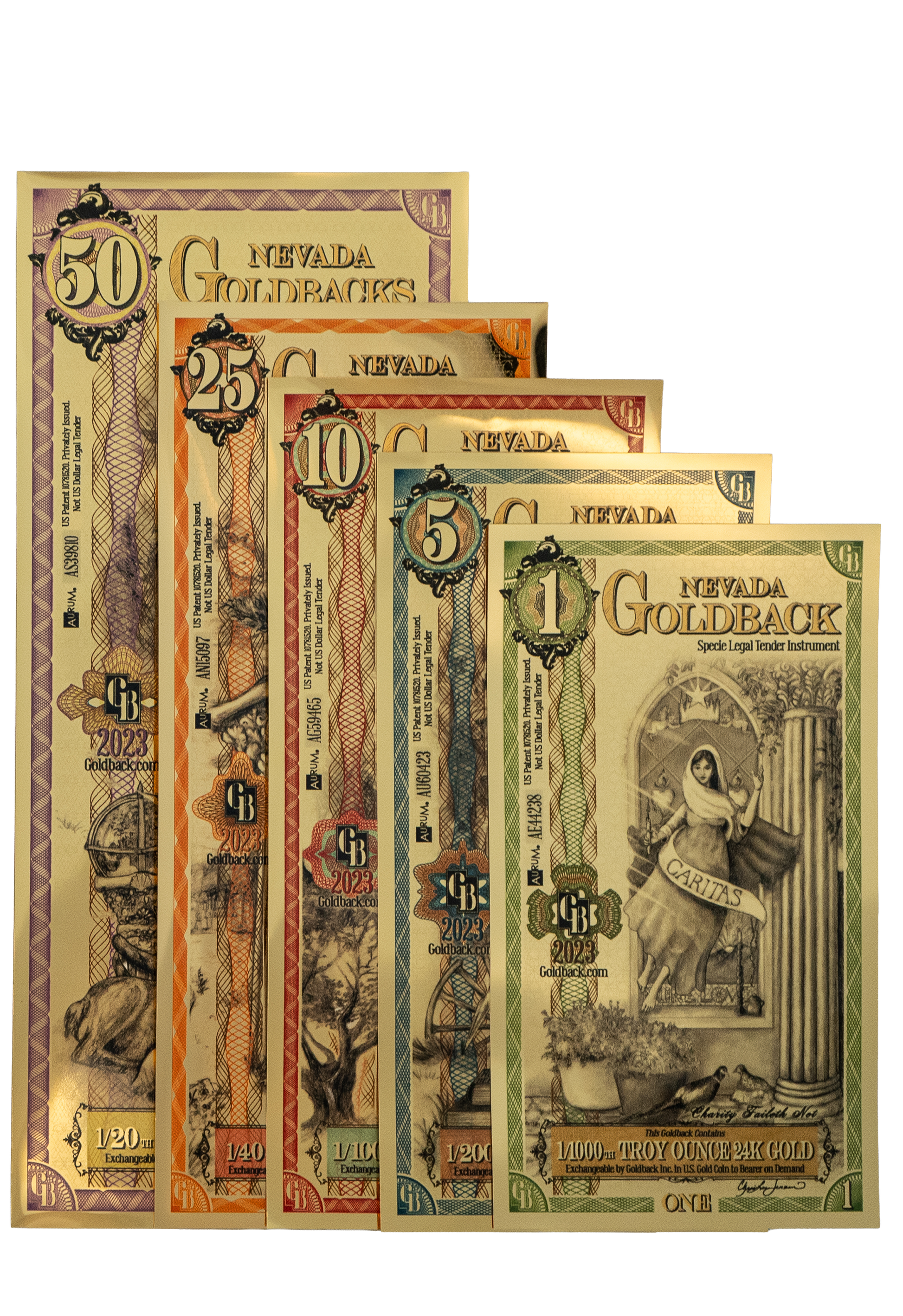 Paquete completo de monedas Nevada Goldback . Adquiera una pieza de oro bellamente elaborada y gastable con este exclusivo paquete Nevada Goldback. Este paquete incluye una moneda de cada denominación: Billetes de oro Goldback de 1, 5, 10, 25 y 50 unidades, cada uno con oro de 24 k, que presentan impresionantes diseños inspirados en la herencia y los valores de Nevada.