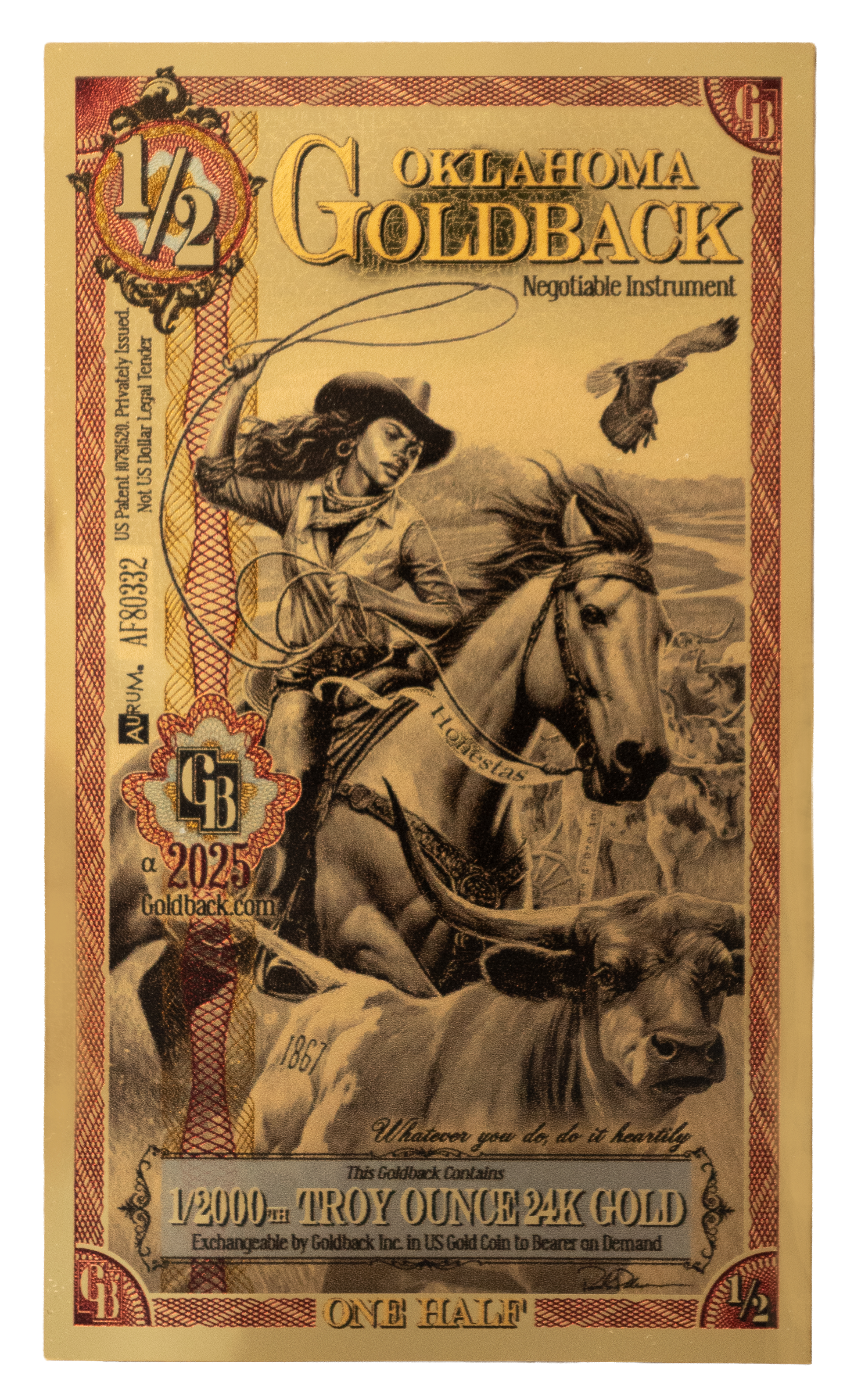 El Oklahoma 1/2 Goldback contiene 1/2000 onza troy de oro de 24 quilates. Este billete forma parte de la primera moneda de oro voluntaria y gastable, ideal tanto para coleccionistas como para el uso diario de oro fraccionario.