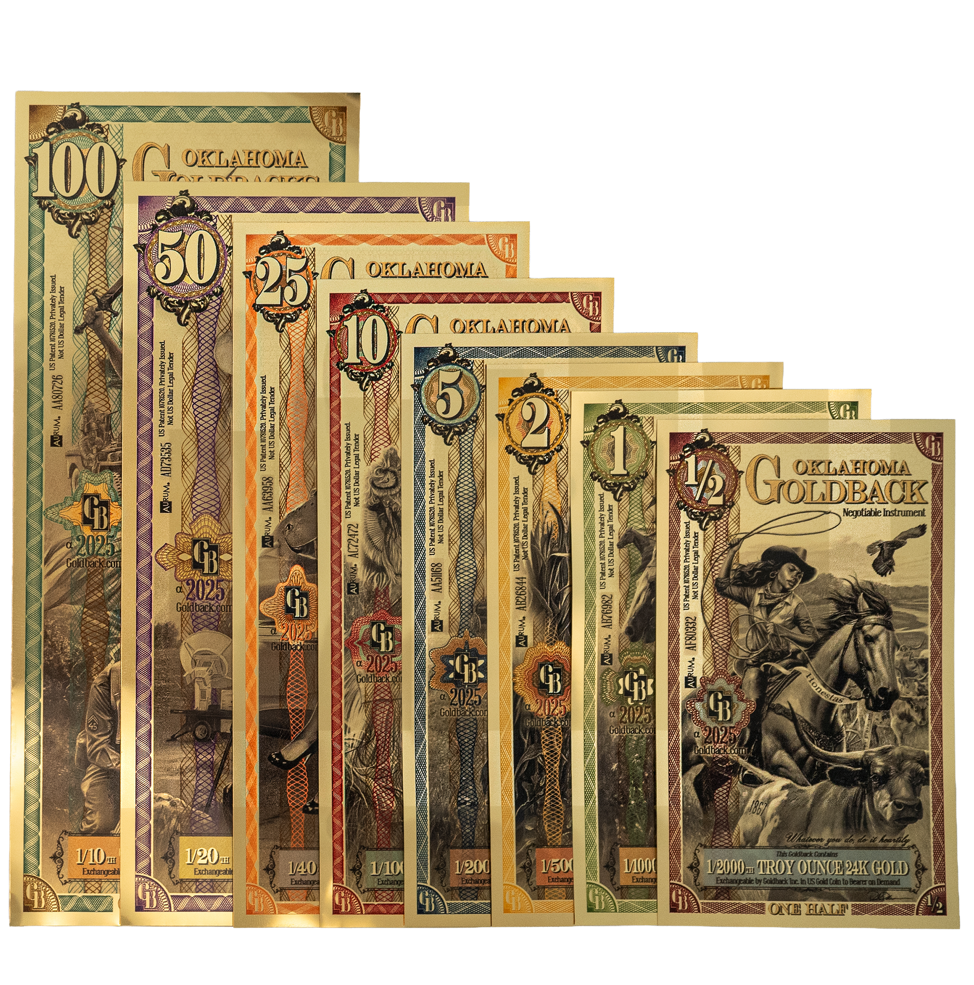 Experimente la belleza y el valor del oro gastable con este Paquete exclusivo de Oklahoma Goldback Alpha. Este juego completo incluye un billete Alpha de cada denominación: 1/2, 1, 2, 5, 10, 25, 50 y 100 Goldback. Cada uno contiene oro de 24k.