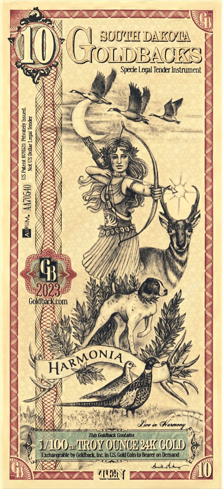Design: Harmonia, or Harmony, debuts on the South Dakota 10 Goldback, embodying a modern Artemis, the Greco-Roman goddess of the hunt, wilderness, and young women. With a drawn bow and a crescent moon behind her, she’s surrounded by South Dakota wildlife like Canada geese, pronghorn antelope, and ring-necked pheasants, symbols of the state's rich hunting heritage. Her diamond-and-feather belt honors the value of women and the sacred nature of femininity. The feathers represent both local game birds and a deeper symbolism tied to fertility and womanhood.