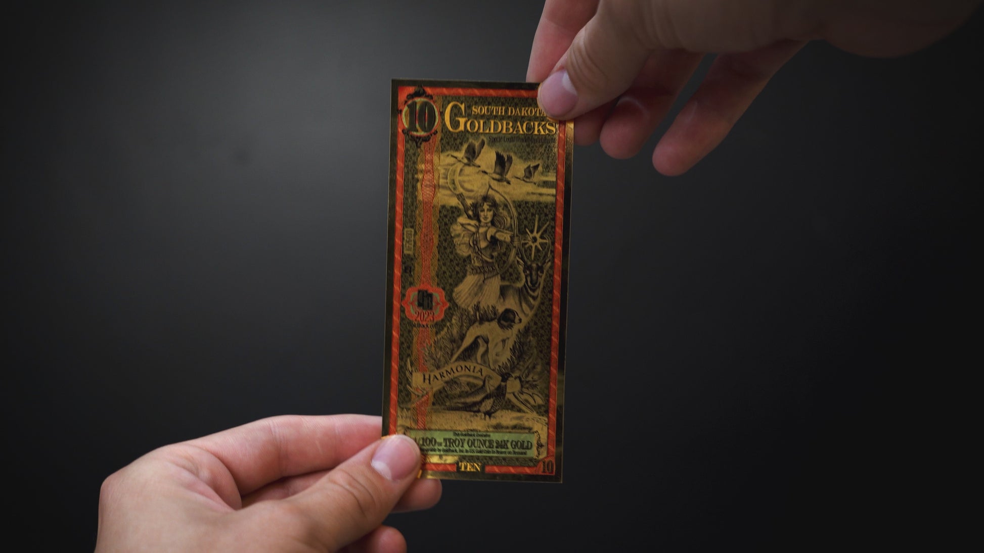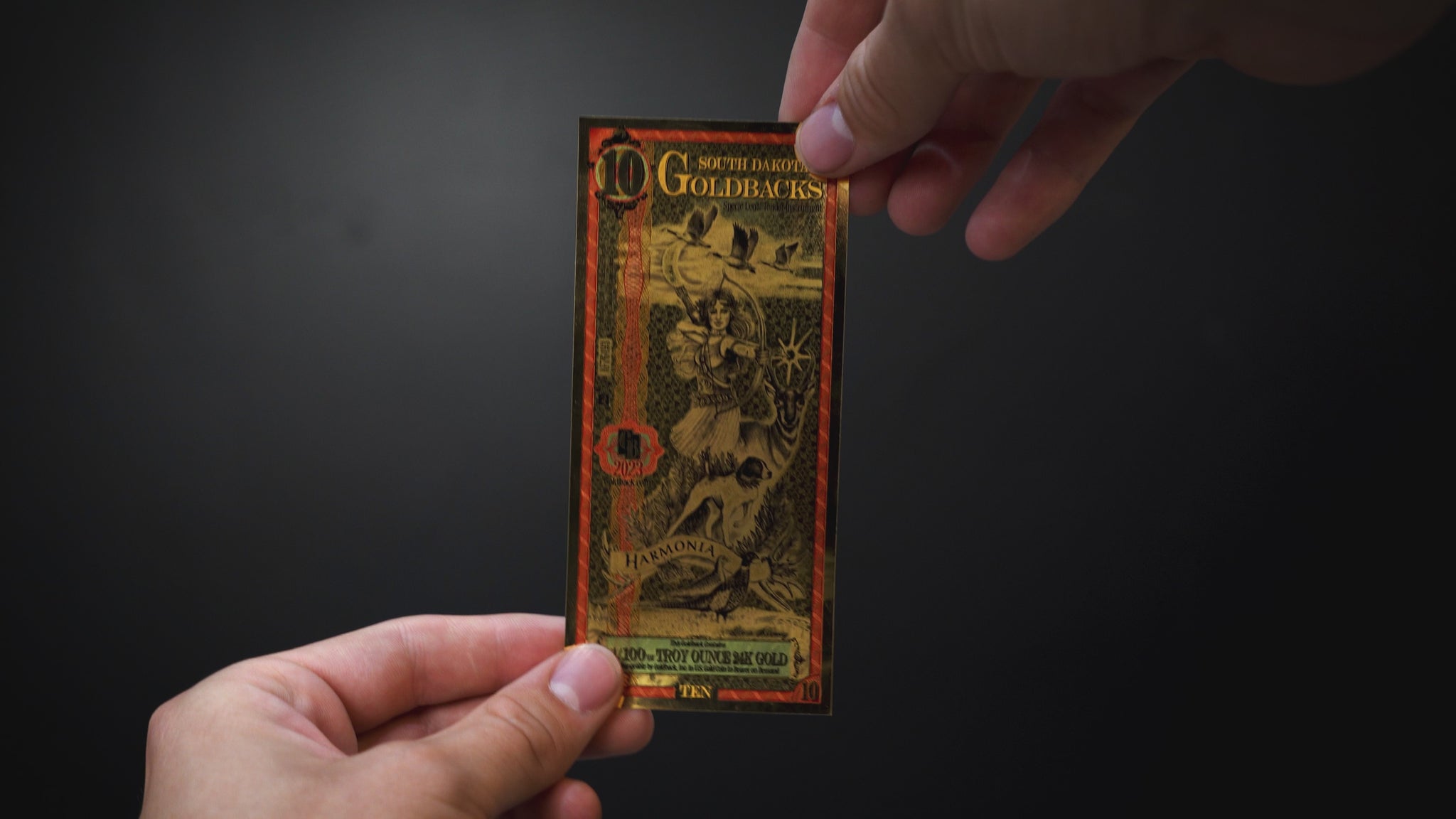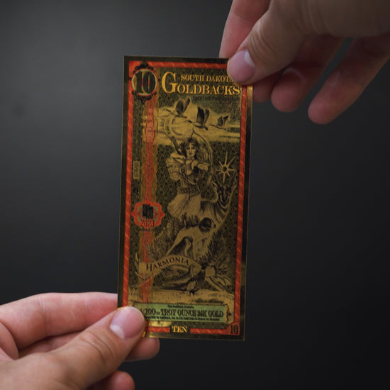 The South Dakota 10 Goldback contains 1/100th Troy Ounce of 24K Gold. This note is part of the first-ever voluntary, spendable gold currency, ideal for both collectors and everyday fractional gold use.