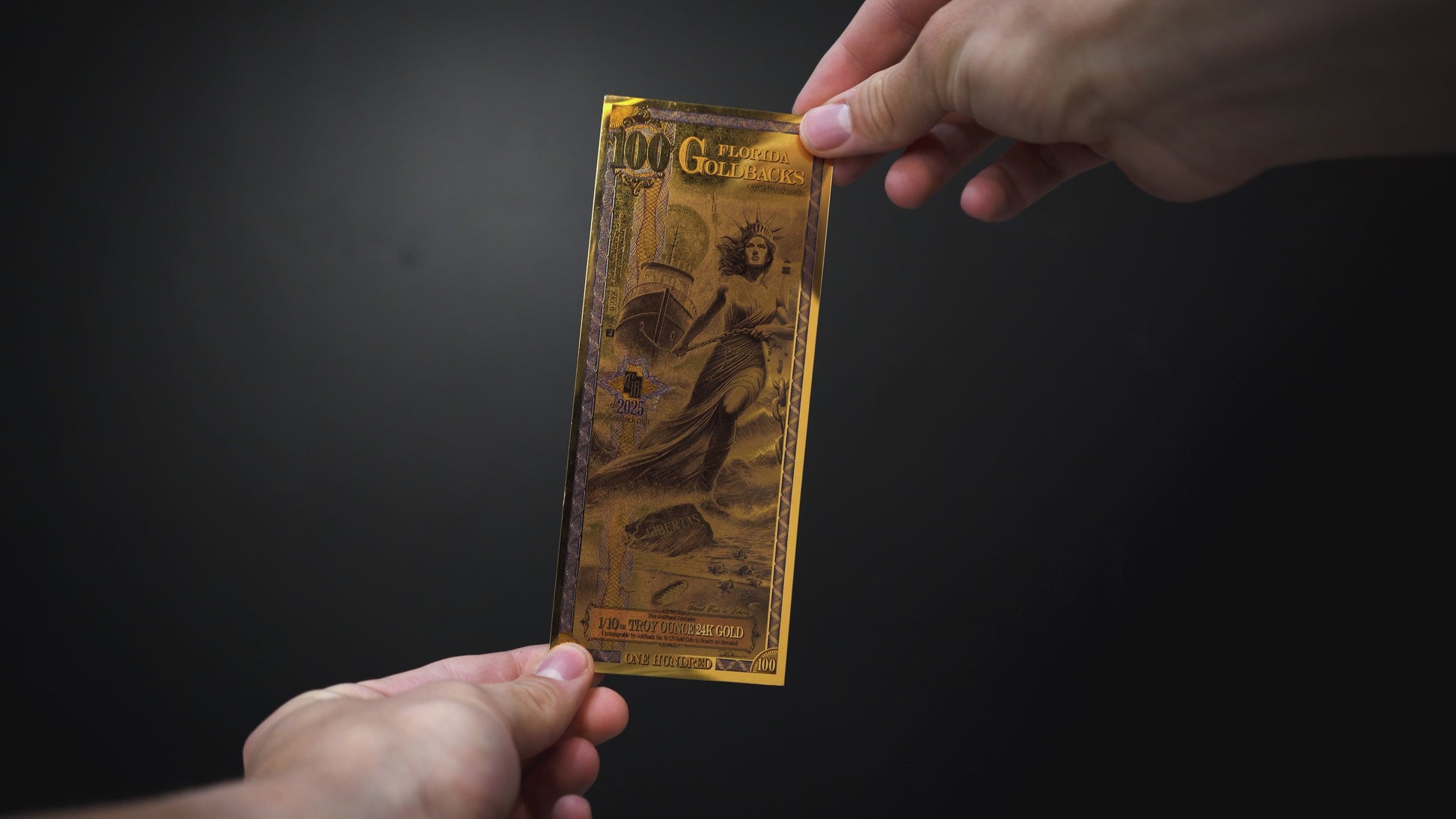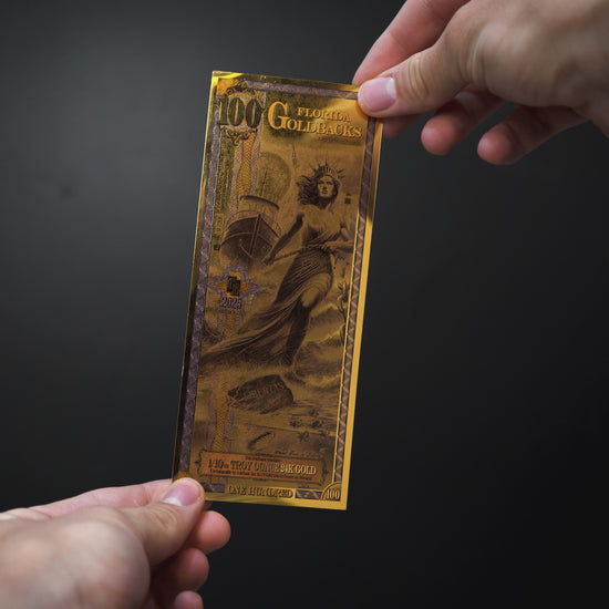 The Florida 100 Goldback contains 1/10th Troy Ounce of 24K Gold. This note is part of the first-ever voluntary, spendable gold currency, ideal for both collectors and everyday fractional gold use.