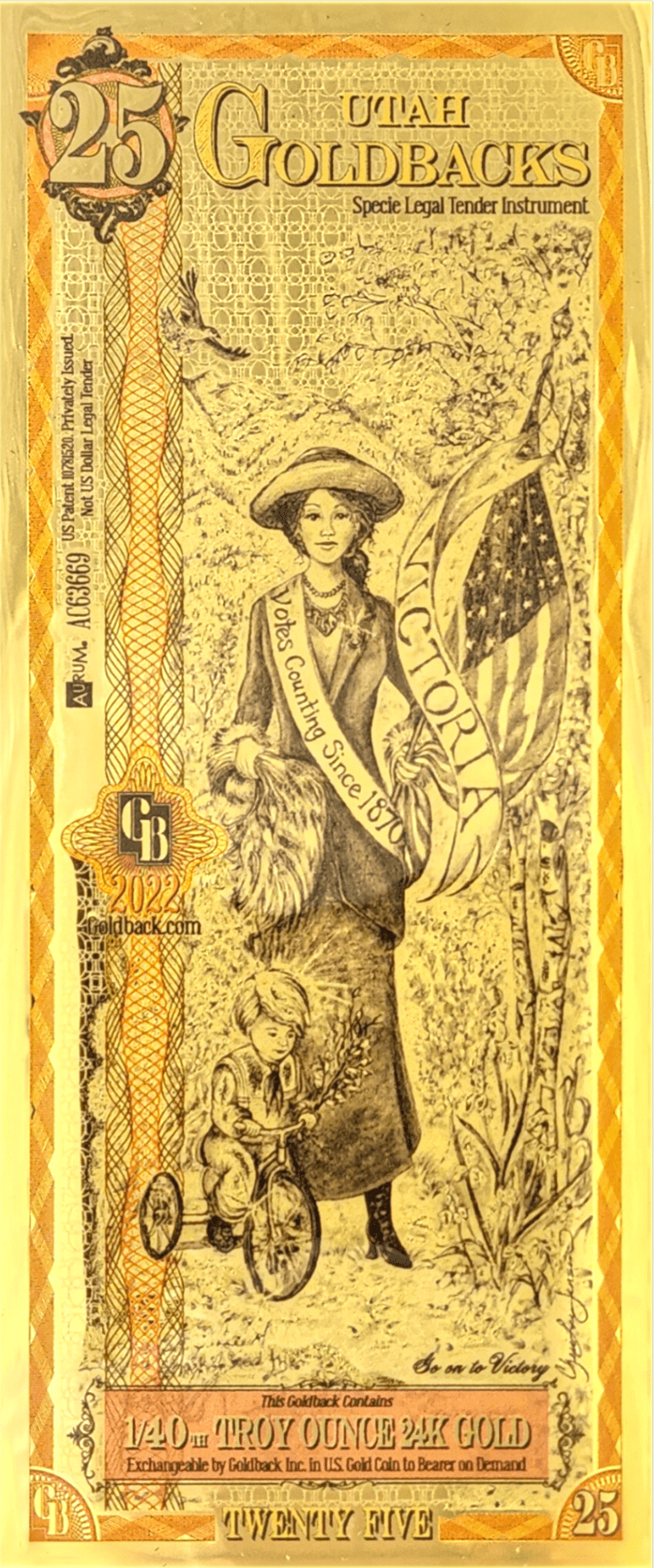 The Utah 25 Goldback contains 1/40th Troy Ounce of 24K Gold. This note is part of the first-ever voluntary, spendable gold currency, ideal for both collectors and everyday fractional gold use.