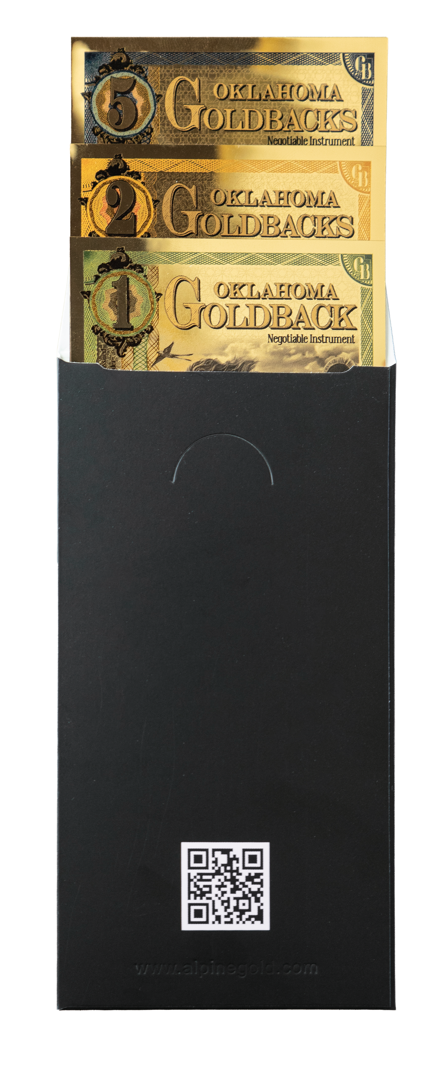 The AGE Embossed Gift Sleeve showcases a refined Matte Black finish, accented with the Alpine Gold Exchange logo elegantly embossed on the front side. On the back side, you will find a QR code with a link to Alpinegold.com. Designed to open from the top, this sleeve securely holds a limited number of the 1/2, 1, & 2 Goldback all the way up to the 5 Goldback. Making it an excellent presentation piece for thoughtful, high-end gifting.