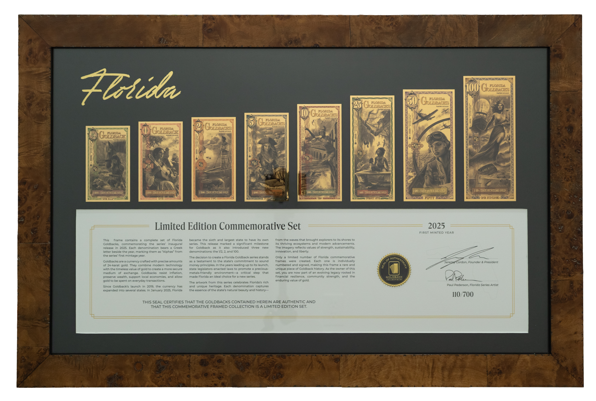There’s no question that the launch of the Florida Series was a pivotal moment for Goldback. This series ushered in a new era of artwork, denominations, and security features. To celebrate this historic launch, we’re releasing a new limited edition product: The Florida Commemorative Framed Goldback Set. This frame houses a complete set of Goldbacks from the Florida series’ first run. This set is very exclusive and limited. This is your chance to own a rare piece of Goldback history and cement your role in the movement for sound money.