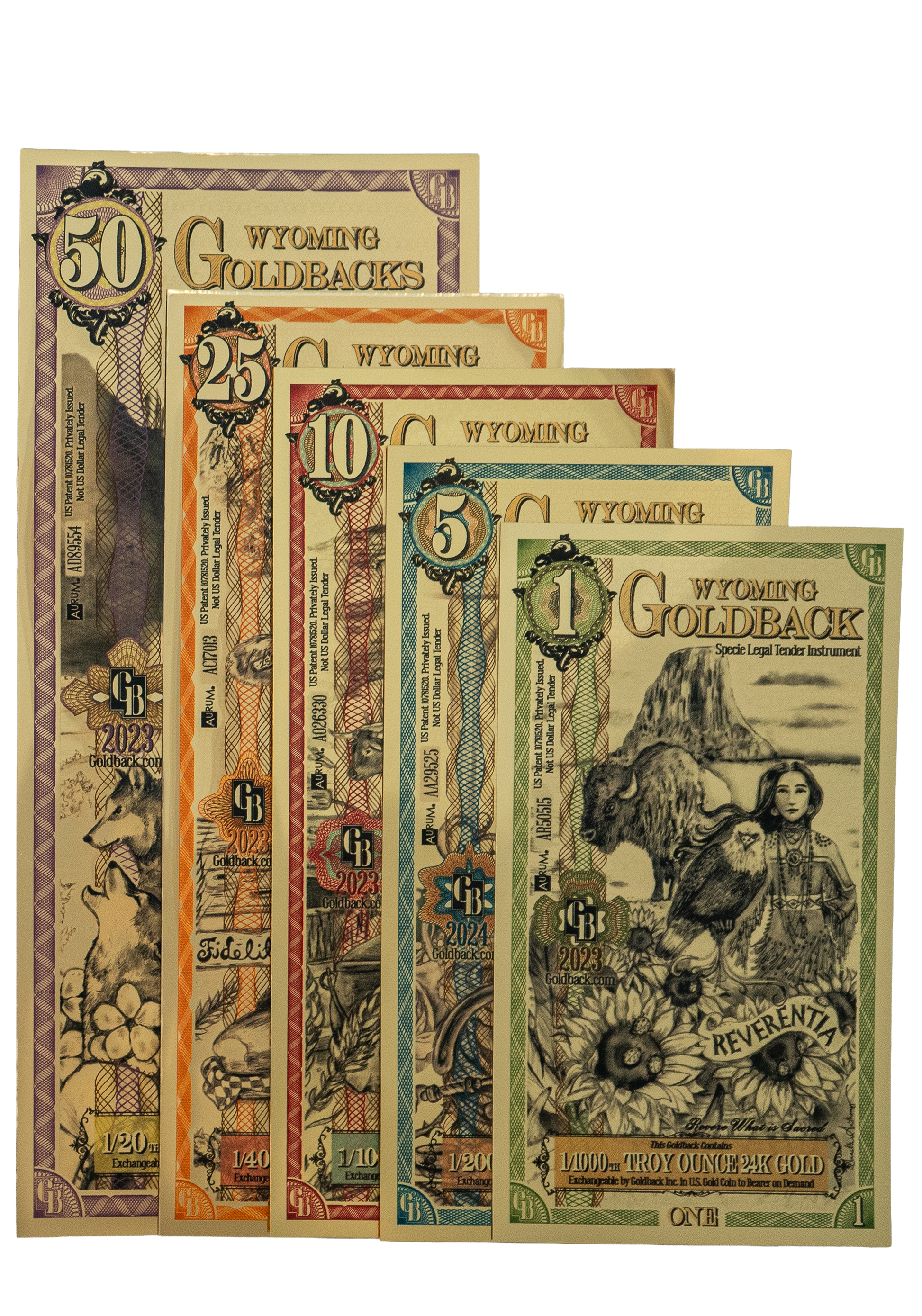 Wyoming Goldback Bundle Complete Denomination Set. Experience the beauty and value of spendable gold with this exclusive Wyoming Goldback Bundle. This complete set includes one of each denomination: 1, 5, 10, 25, and 50 Goldback notes, each containing 24k gold. Every note showcases stunning artwork inspired by Wyoming’s rich heritage, values, and spirit, making them both a visual masterpiece and a tangible asset.